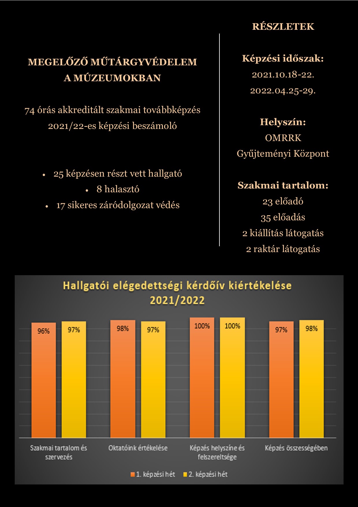 Az oktatáson részt vett hallgatók elégedettségi kérdőív kitöltésével segítették a képzés minőségellenőrzési folyamatait, az eredmények alapján az alábbi értékelés született a Megelőző műtárgyvédelem a múzeumokban szakmai továbbképzésről.